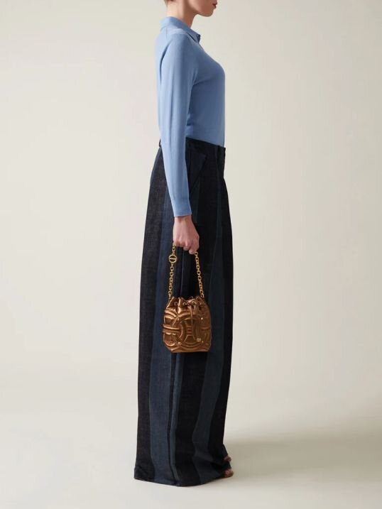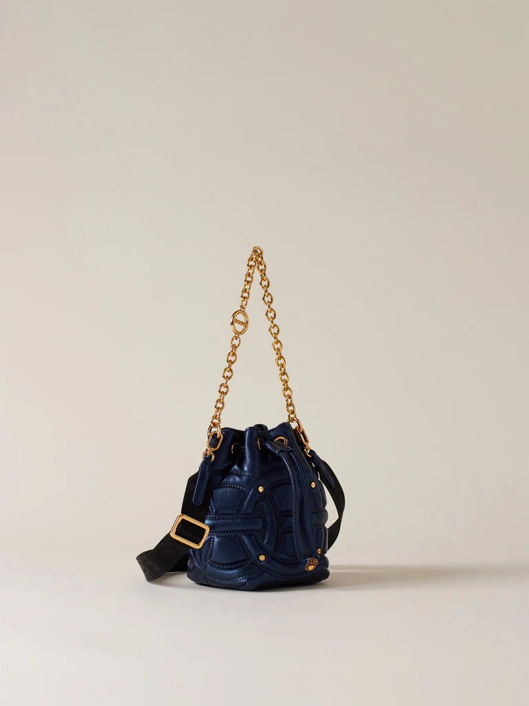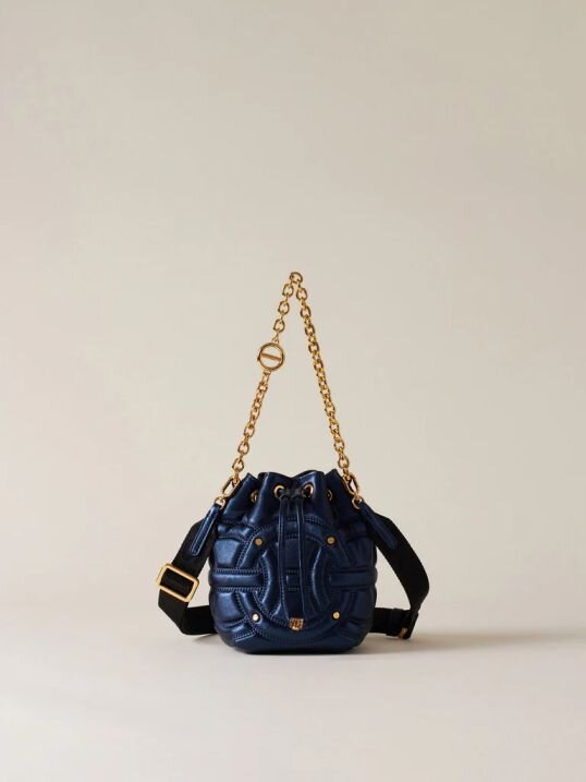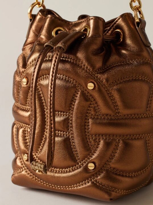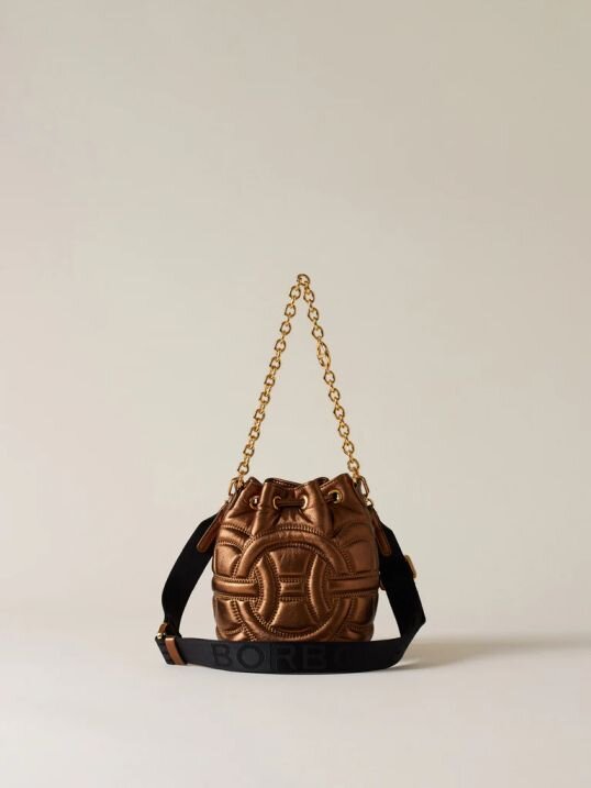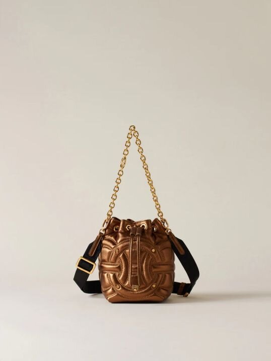 Nappa laminata matellasse' con disegno vite, dettagli in Camoscio Op, fodera di tessuto jacquard riciclato, chiusura a coulisse, tracolla di catena con elemento vite logata, tracolla regolabile e removibile in nastro logato regolabile e removibile con moschetton, metallerie oro e misura mini.