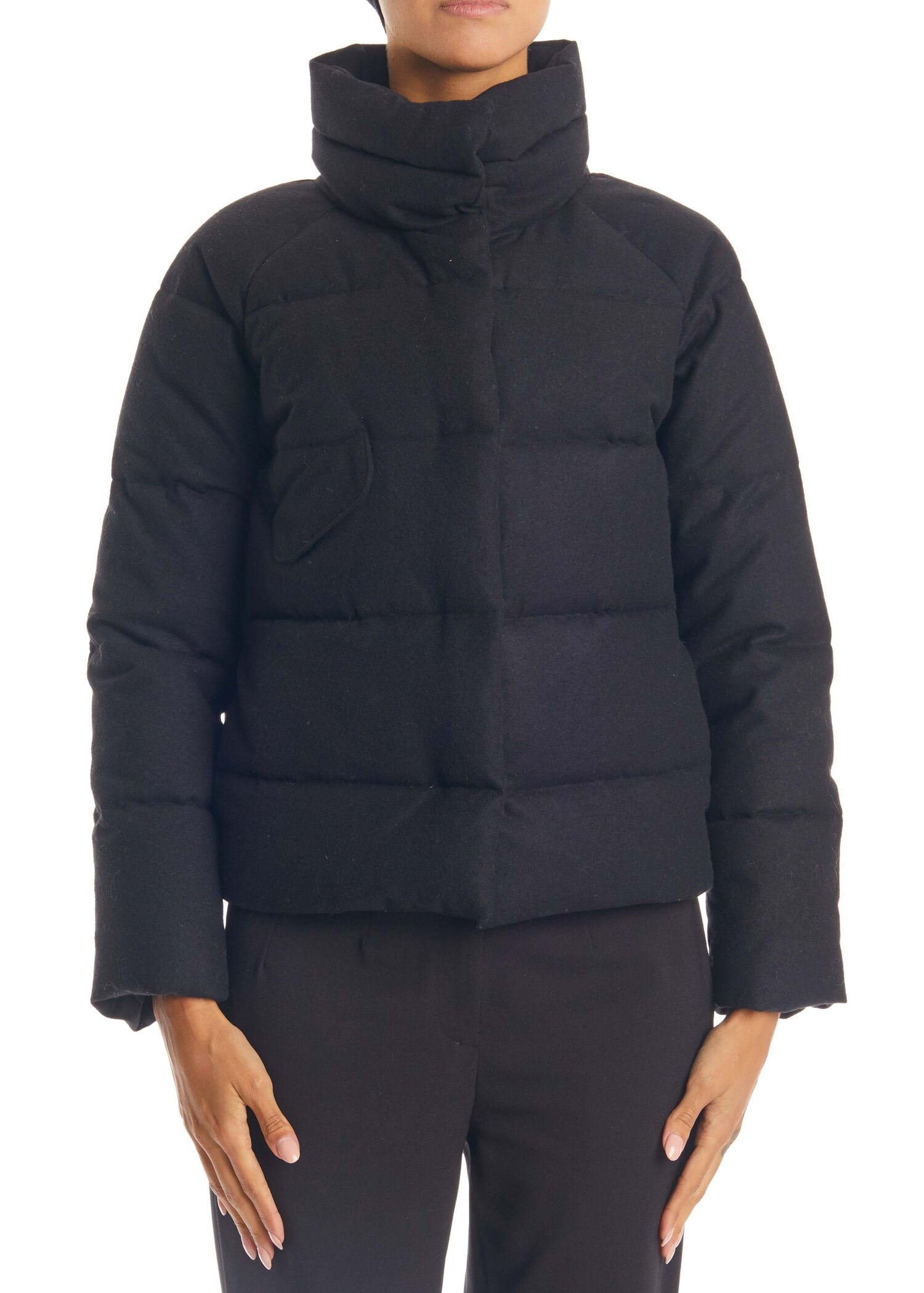 Piumino imbottito con esterno in flanella di lana, collo alto.