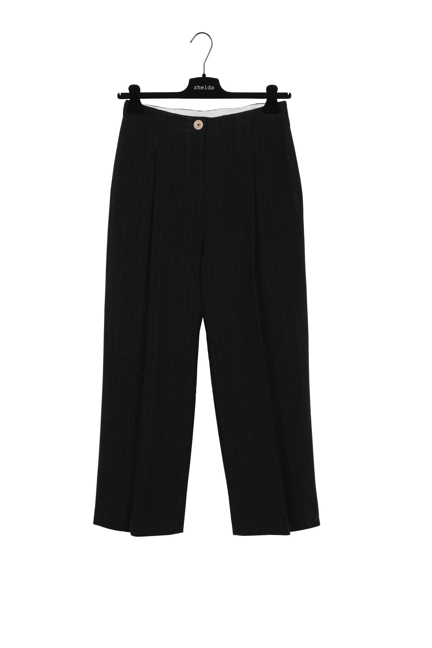 Pantalone in cotone e lana gessato, chiusura con bottone e zip e due tasche laterli.