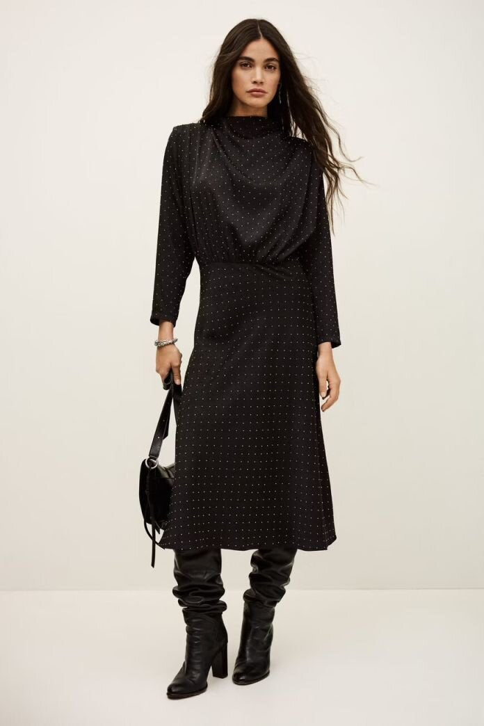 Abito da sera, maniche a pipistrello, colletto asimmetrico con pieghe, spacco sul retro e dettagli pieghe sulla gonna.