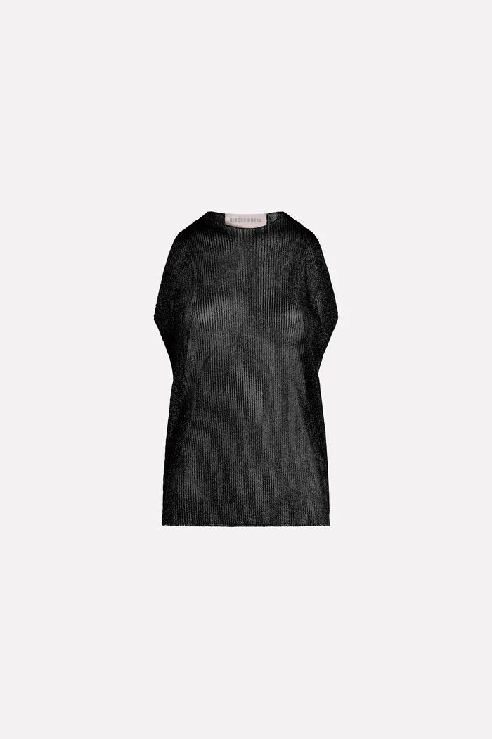 Canotta con scollo halter plissettata semi trasparente, vestibilità slim fit e lunghezza alla vita.