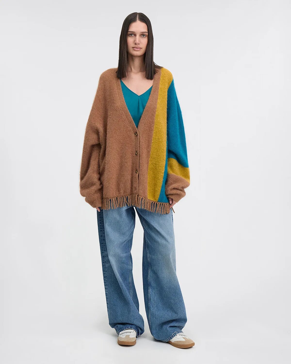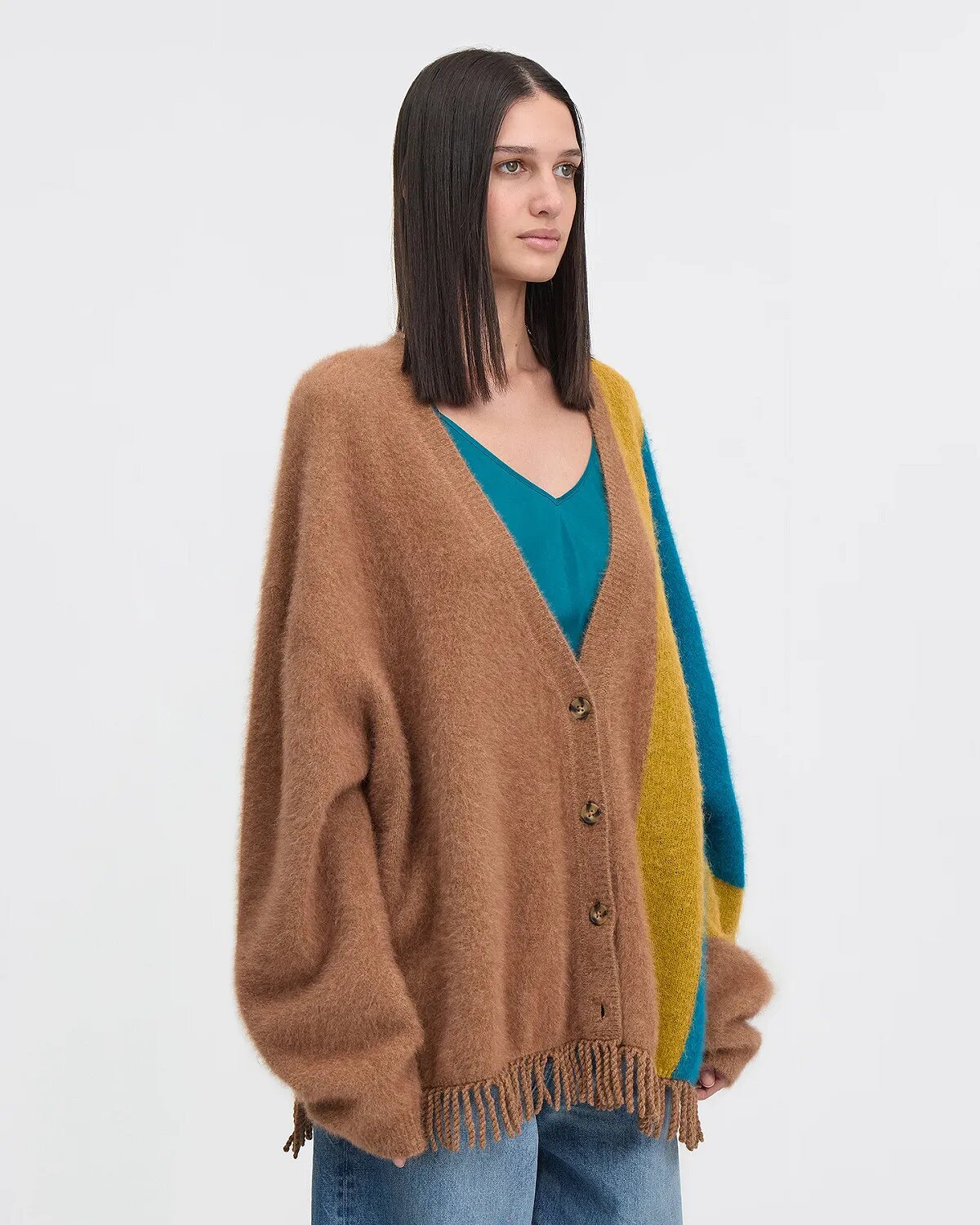 Cardigan caldo e morbido con franhe sul fondo, effetto avvolgente ed elegante.
