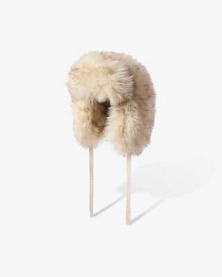 Chapka avvolgente in pelliccia sintetica écru, impreziosito da lievi rilievi più scuri che gli conferiscono un aspetto vivace e materico. I lati possono essere sollevati e chiusi con un discreto bottone automatico, consentendo di modulare il volume e variare l'indossabilità in base al proprio umore o alle condizioni meteorologiche. Un capo caldo, morbido e di carattere.