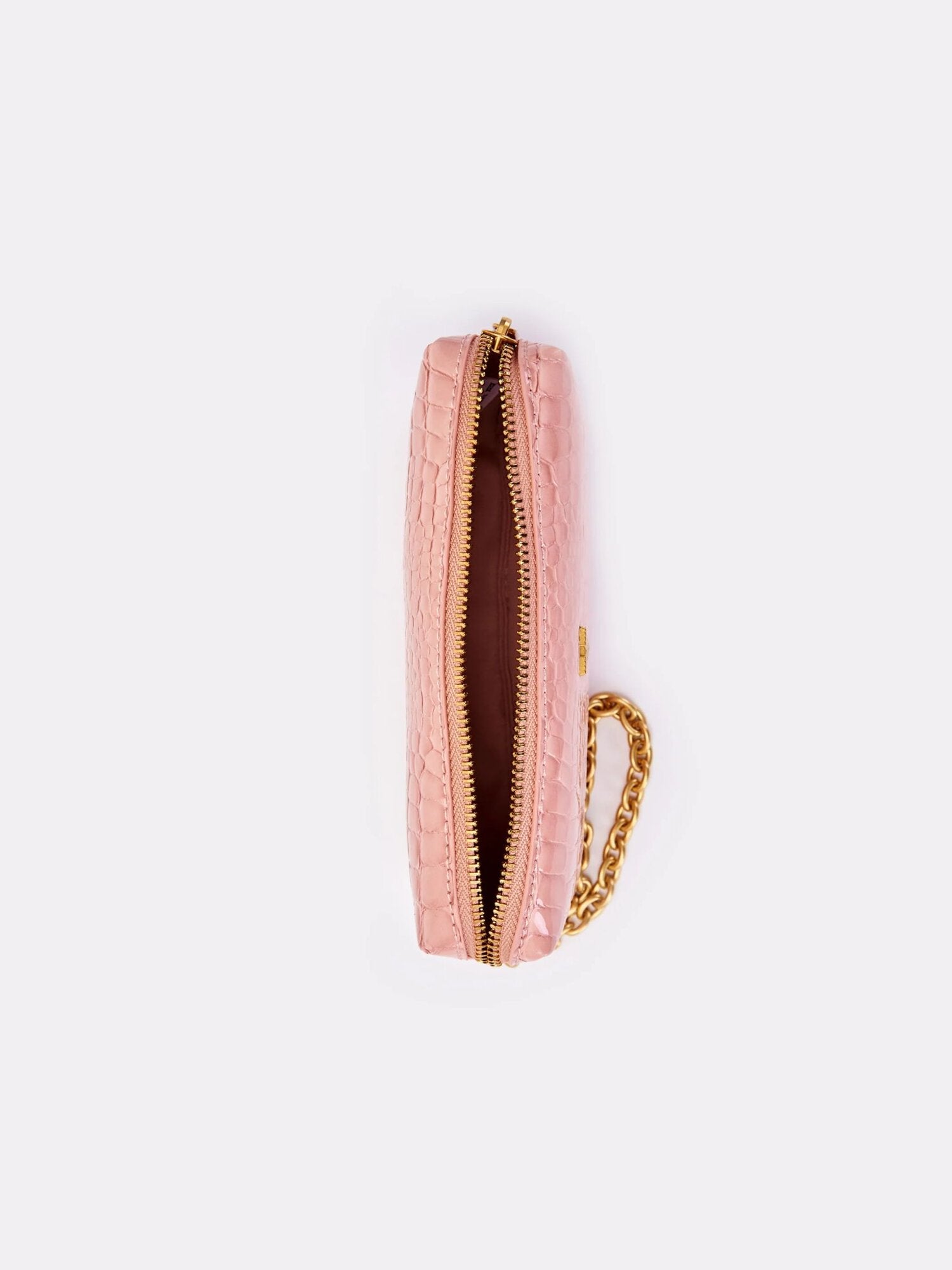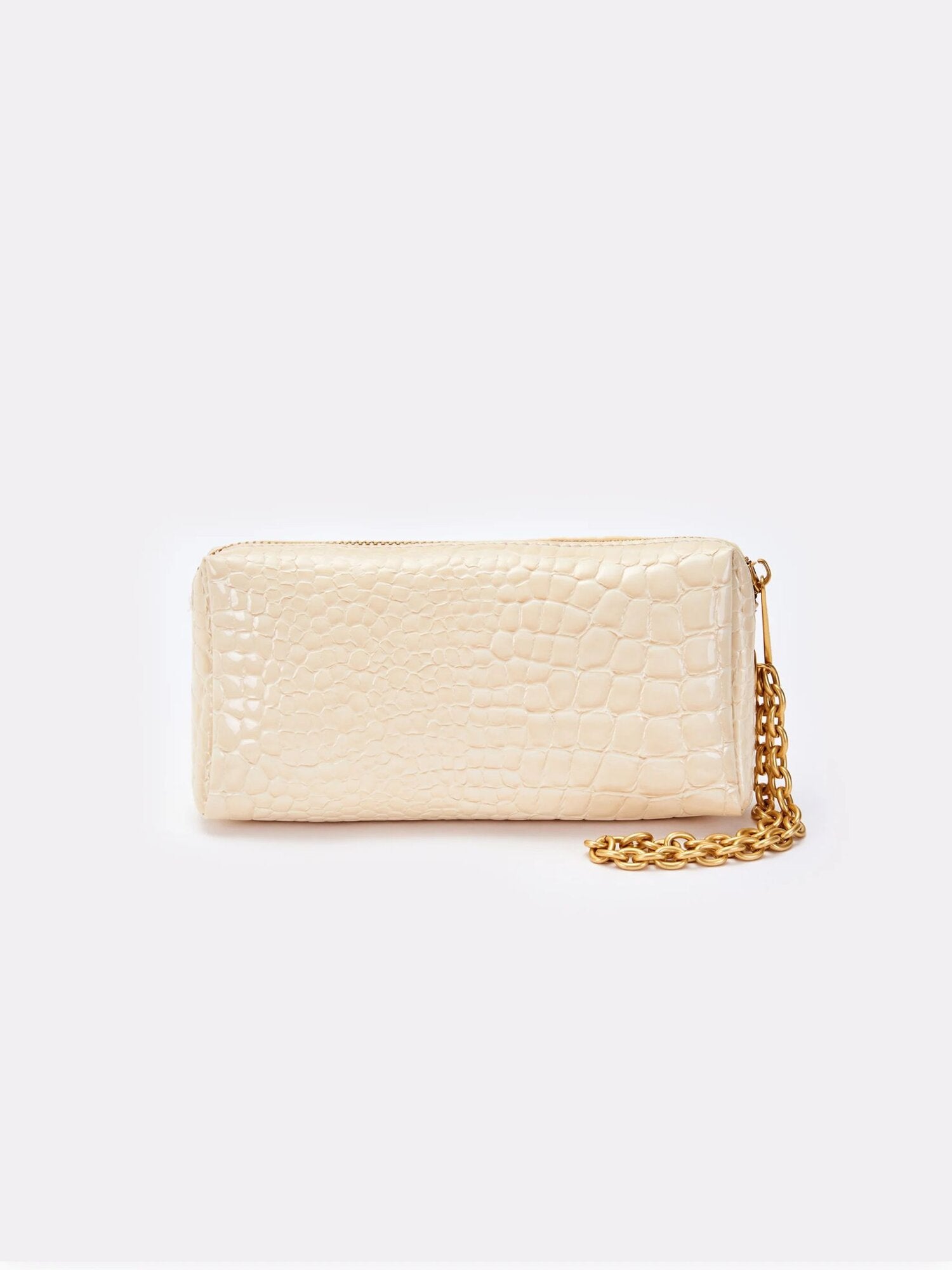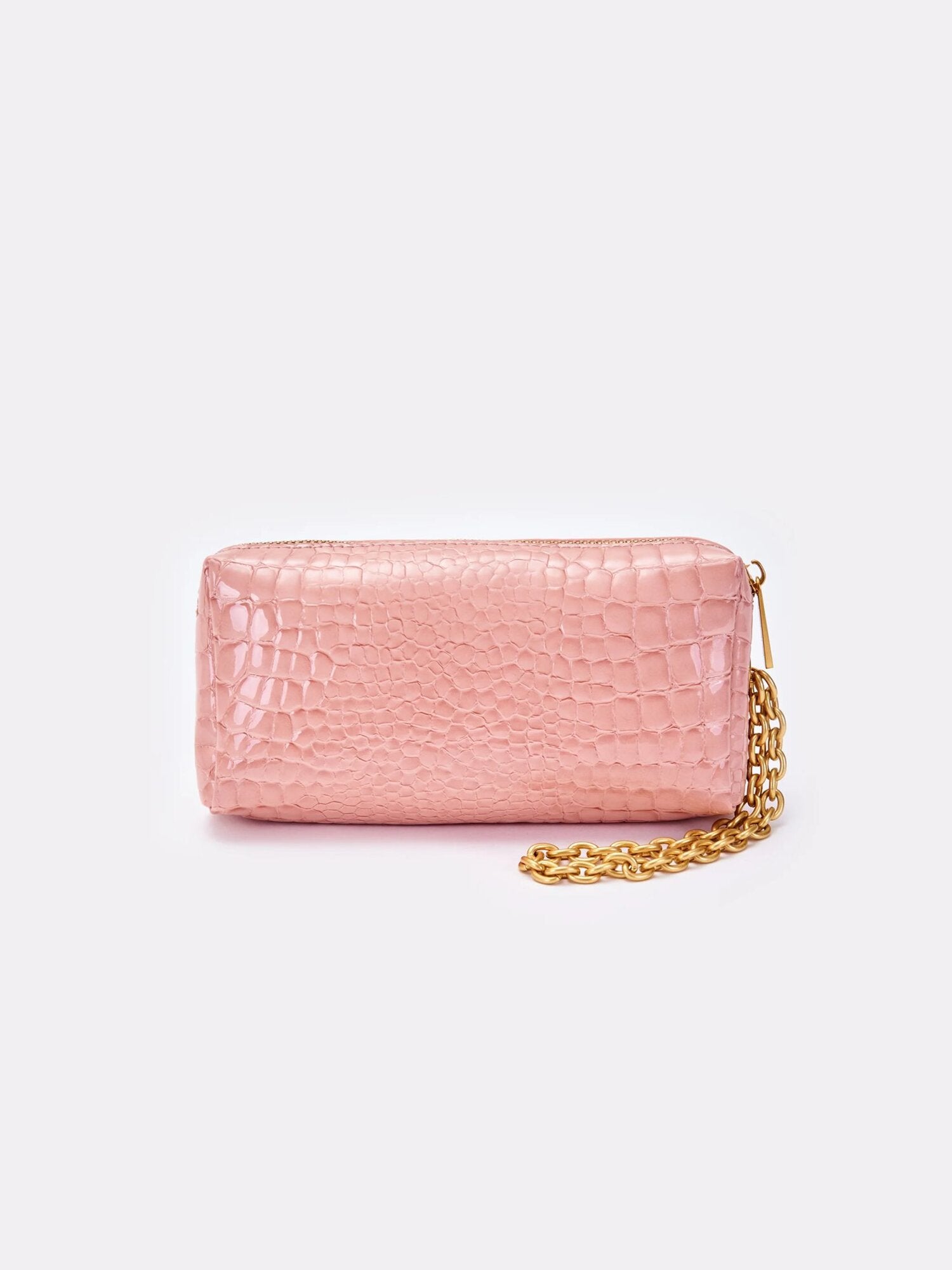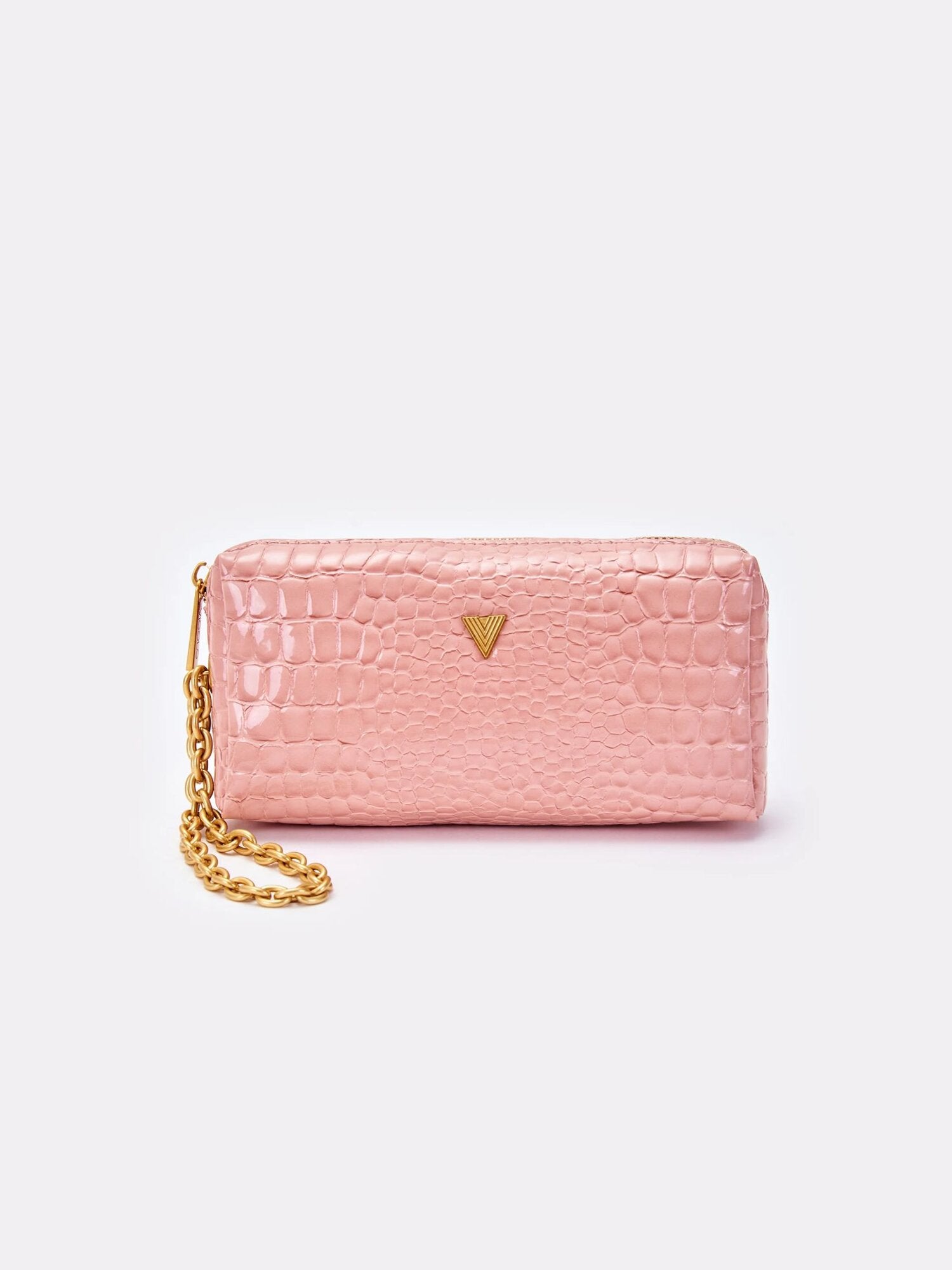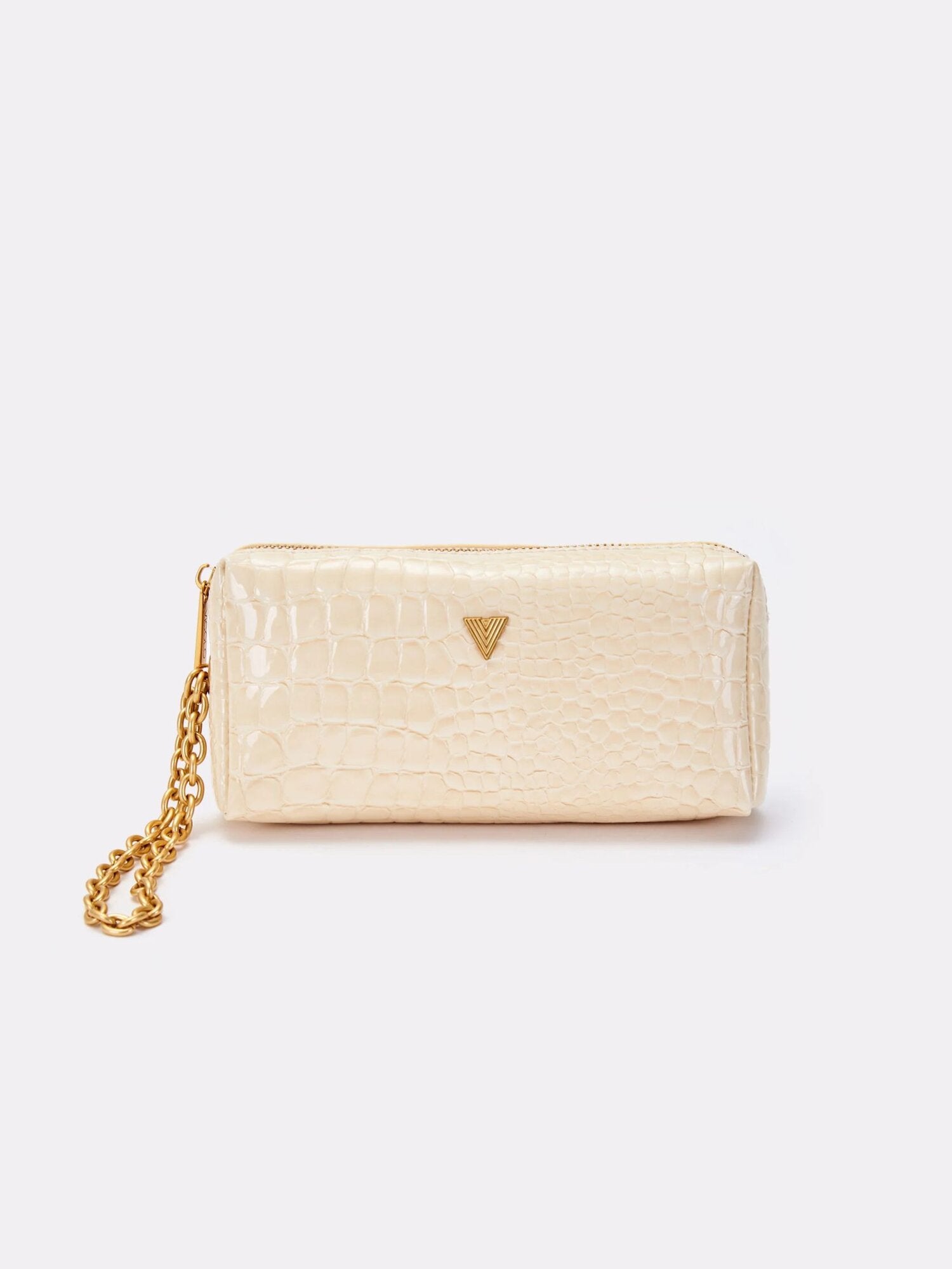 Borsa a mano in ecopelle effetto "coco" in vernice, chiusura con cerniera, dettaglio fibbia V metal plate Vicolo, dettagliofiniture anticate color oro easca interna con cerniera e taschina piatta.