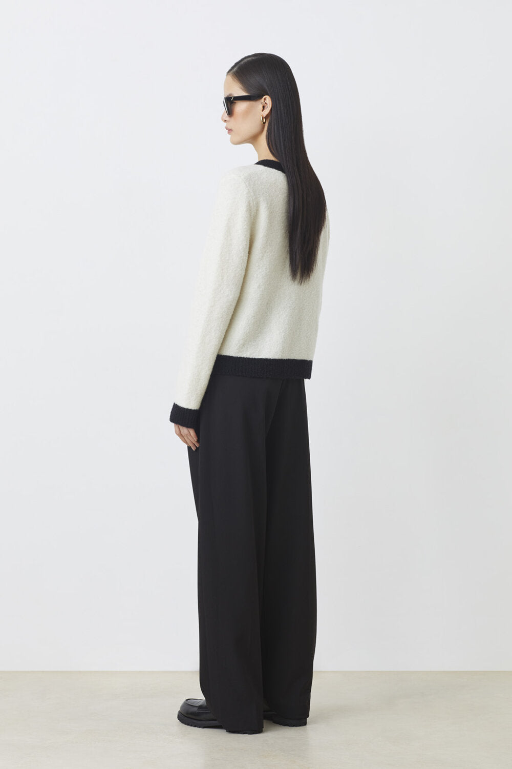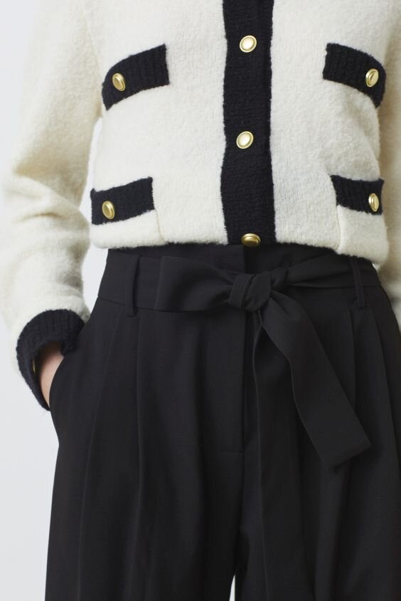 Pantalone gamba larga con cintura, chiusura con zip, cintura tono su tono removibile, due tasche laterali.