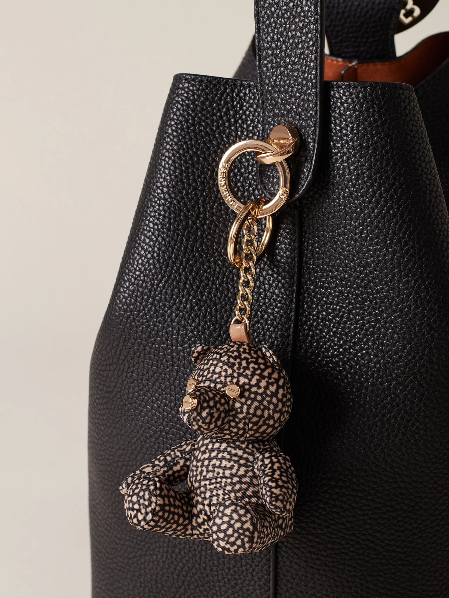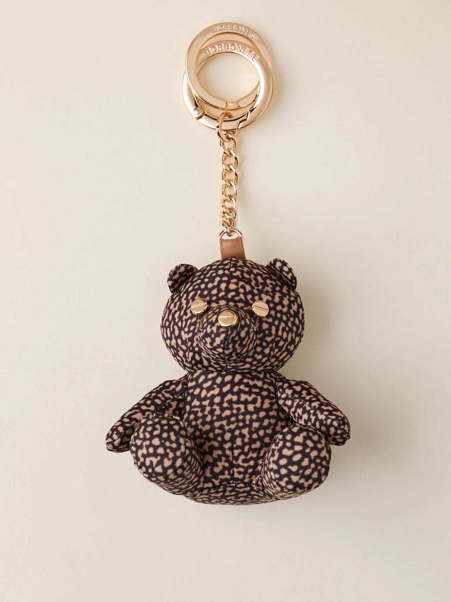 Portachiavi con ciondolo di tessuto riciclato OP e pelle a forma di orsetto. Può essere utilizzato come charm per impreziosire la tua borsa preferita. Galvanica in oro chiaro.