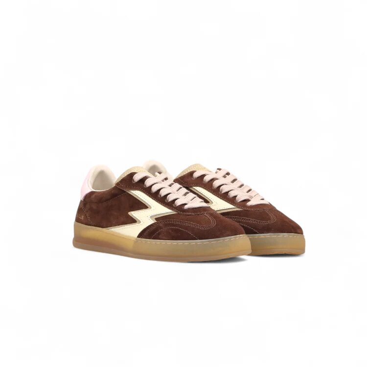 Sneaker da donna cacao basse made in Italy in suede, con logo in pelle martellata burro e backtab in pelle rosa chiaro.