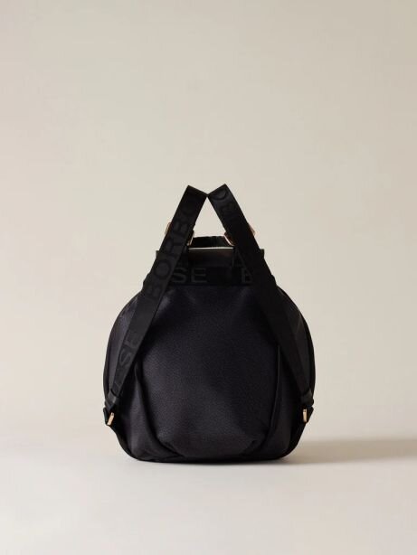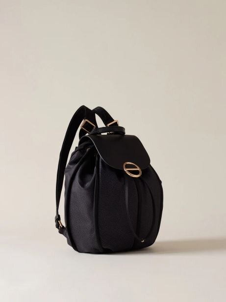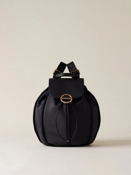 Tessuto riciclato stampa Op, dettagli in pelle e profili in nylon unito, fodera di tessuto jacquard riciclato, chiusura con coulisse e patta con magnete, una tasca interna aperta, spallacci in nastro logato regolabili, metallerie oro chiaro e misura medium.